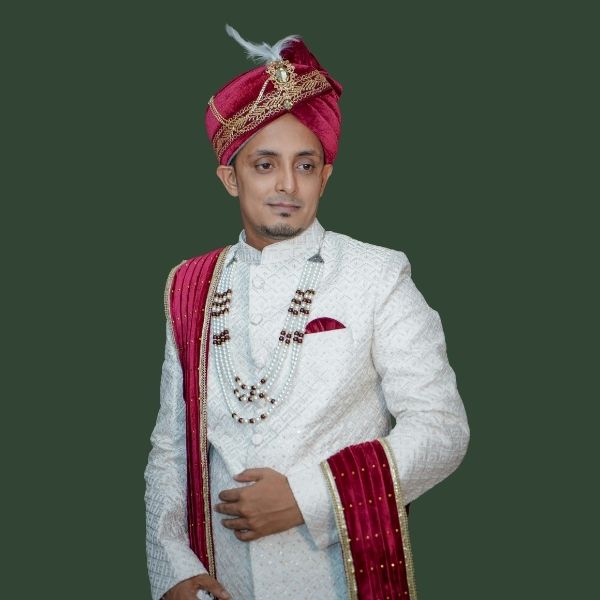 Accessories Included: Maroon Safa (Turban), Beaded Pearl Necklace, Pocket Square